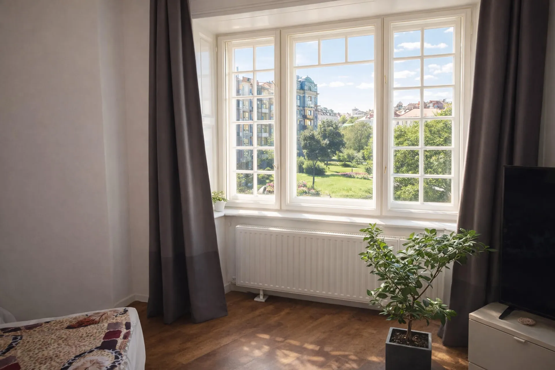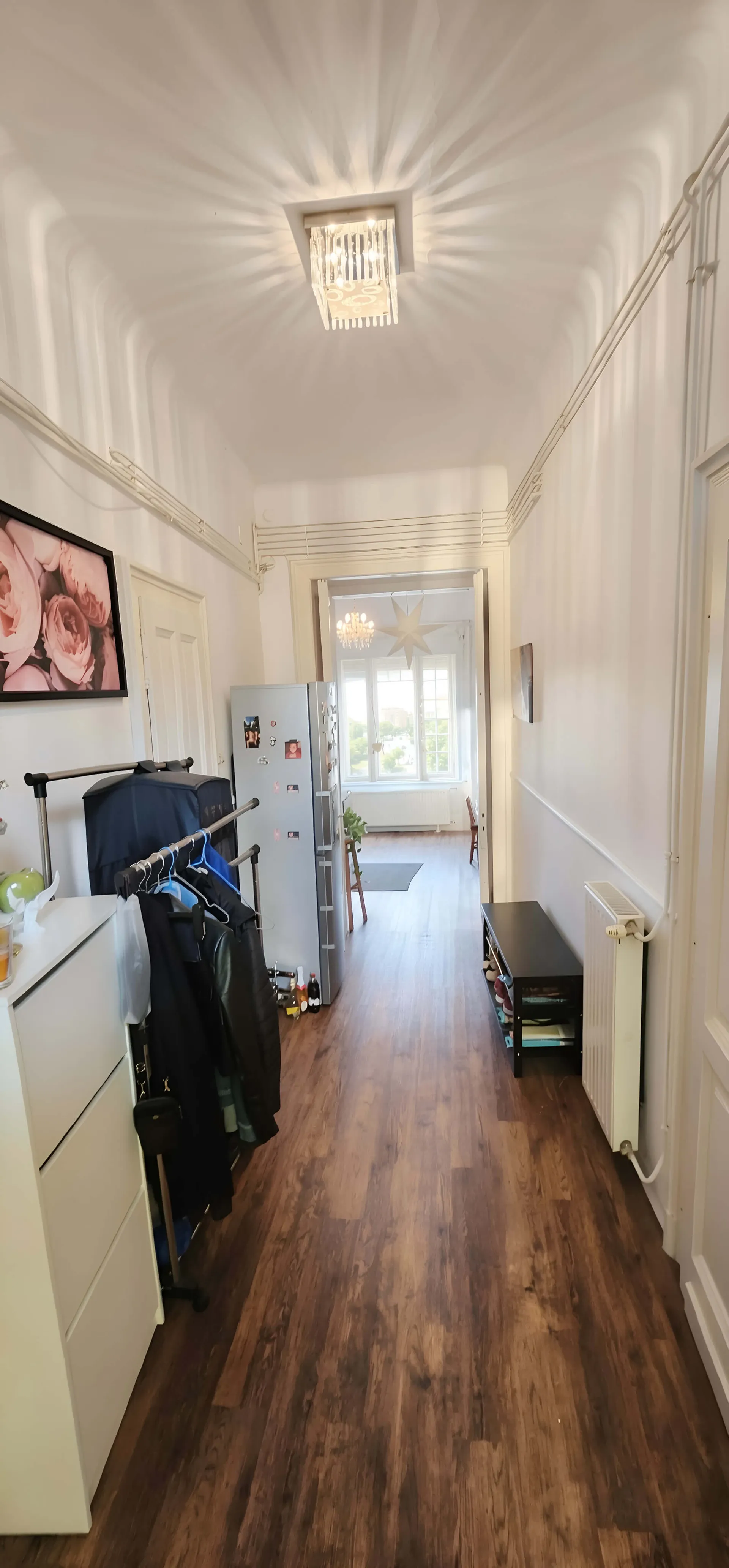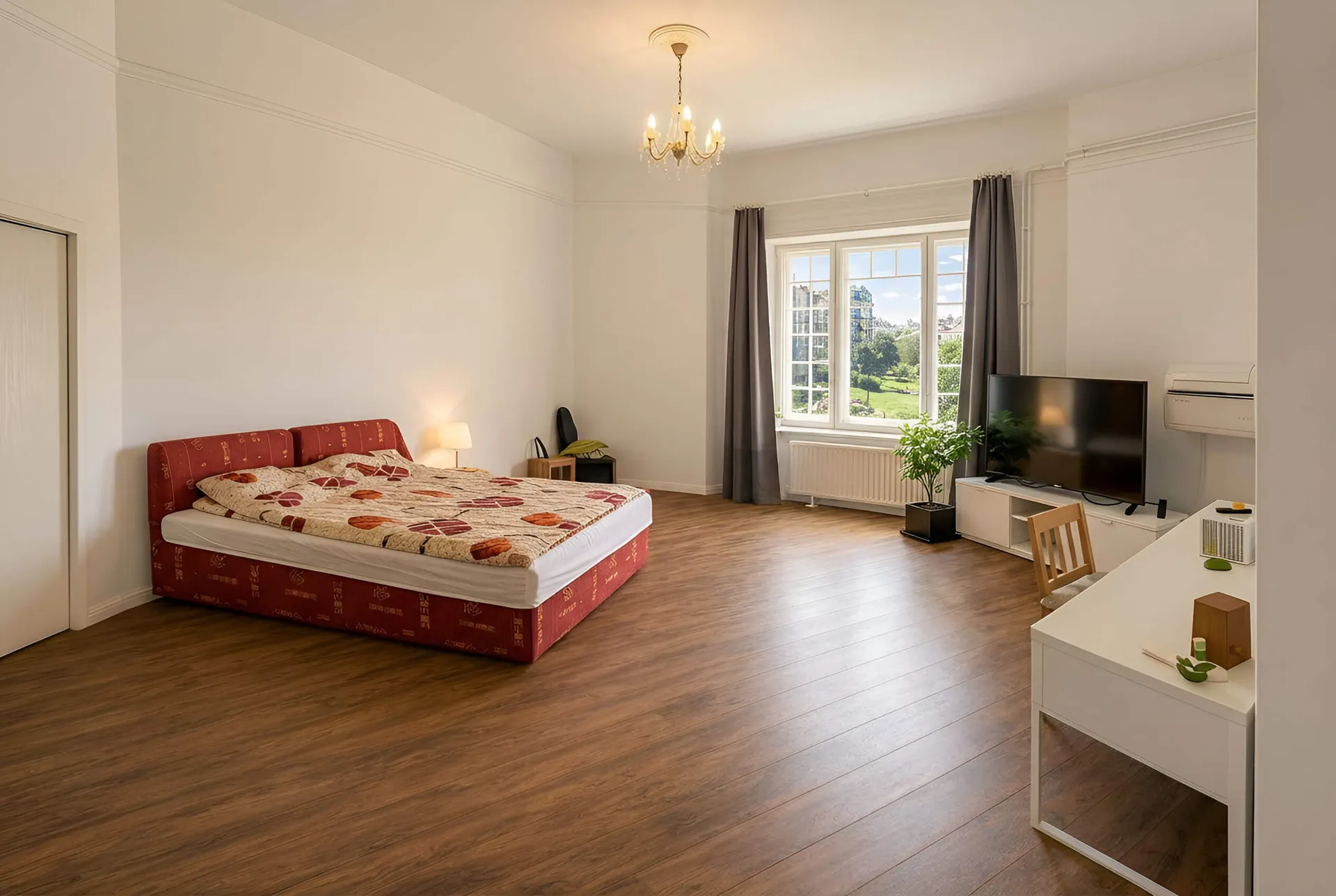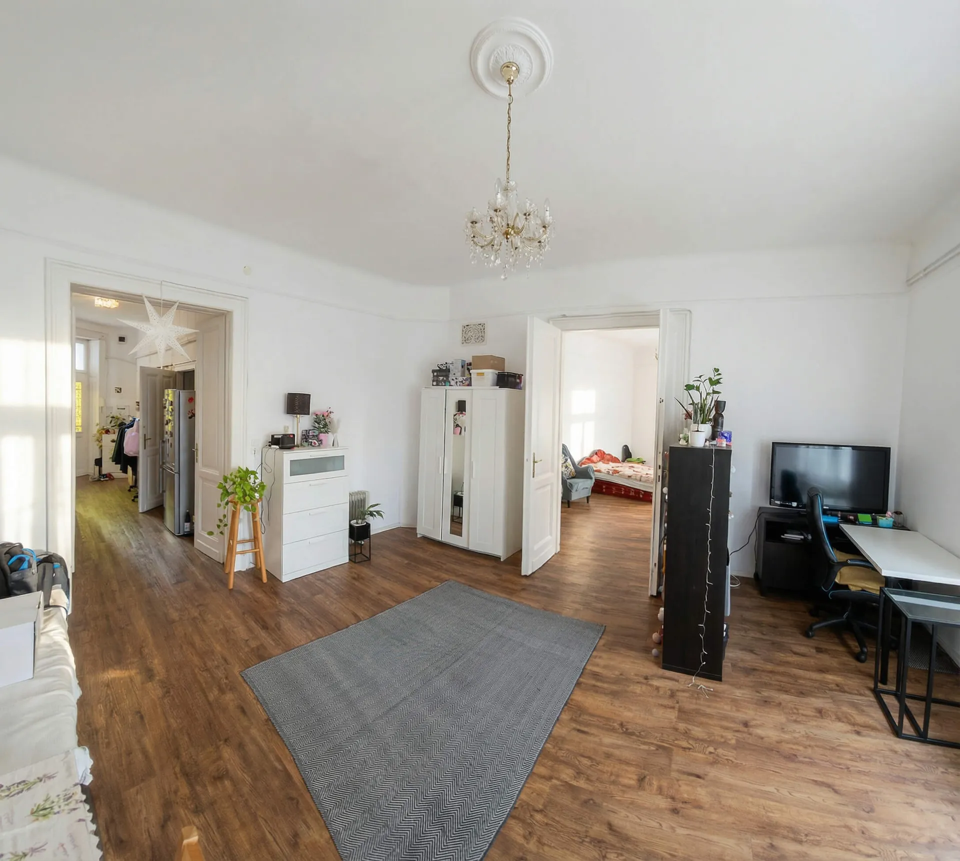 Der Grundriss bietet außergewöhnliche Flexibilität: Das Wohnzimmer, das direkt neben dem Badezimmer liegt, lässt sich mühelos in einen offenen Wohnbereich mit amerikanischer Küche umwandeln. Dieser Umbau ermöglicht zwei völlig separate Schlafzimmer und einen geräumigen gemeinschaftlichen Wohnraum, der klassische Eleganz mit moderner, funktionaler Raumaufteilung verbindet. Im Keller befindet sich ein privater Lagerraum von 5 m². Bitte beachten Sie, dass es im Gebäude keinen Aufzug gibt.